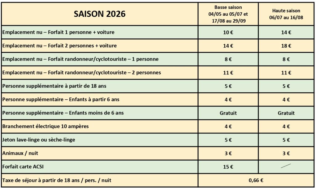 Retrouvez les différents tarifs des emplacements nus selon votre situation : une ou plusieurs personne(s), votre moyen de locomotion, enfants, etc…